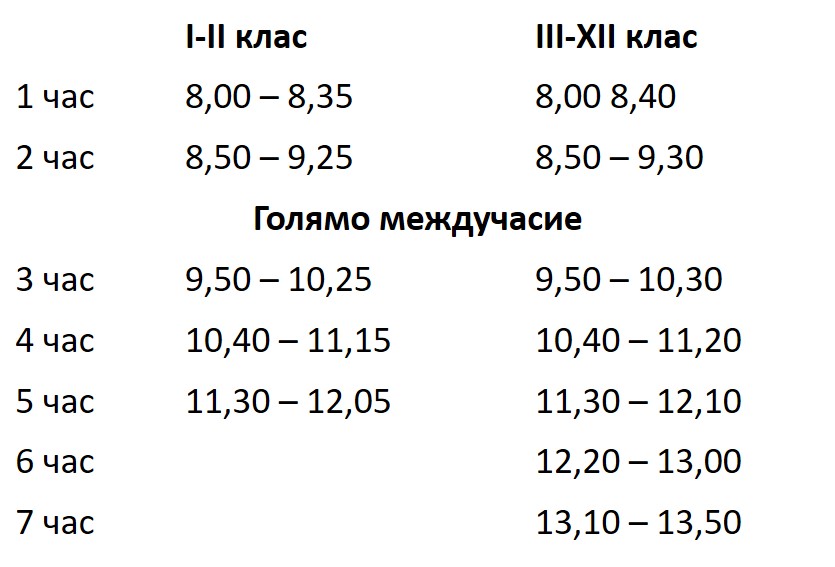 РАЗПИСАНИЕ НА ЧАСОВЕТЕ ![]() ------------------------------------------------ Ако срещате трудности с платформата, споделете с класния ръководител или се свържете с администратор.