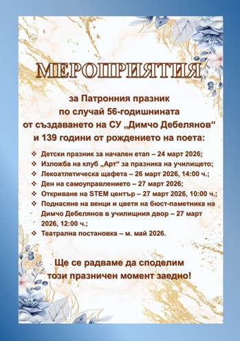 СЕПТЕМВРИЙСКА СЕСИЯ 2024/2025 В периода от 01 до 12 септември 2025 г. в СУ "Димчо Дебелянов" ще се проведат изпити на учениците от СФО съглано график.