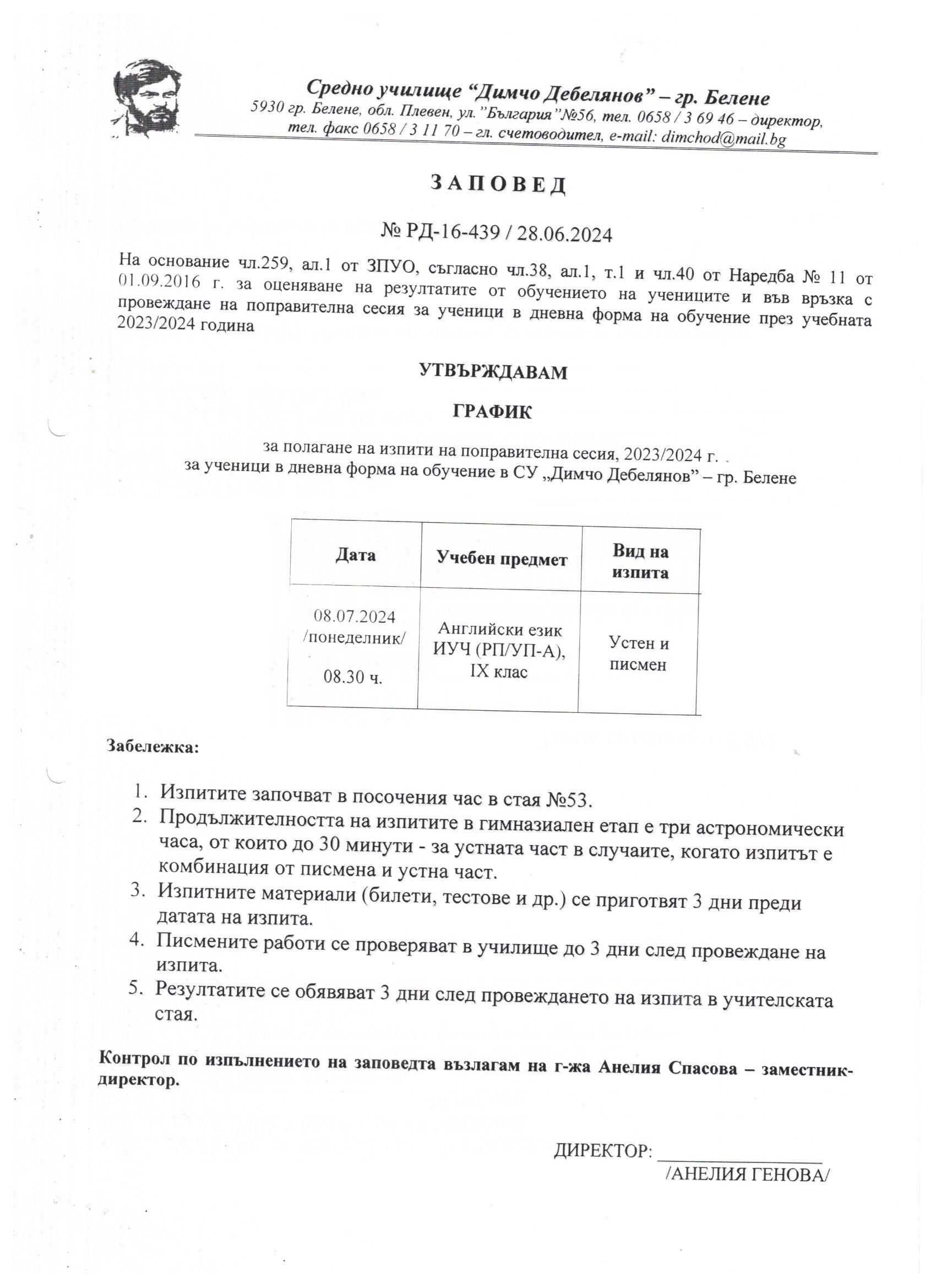 * Заповед на директора с утвърден график за полагане на изпити на поправителна сесия, 2023/2024 г.